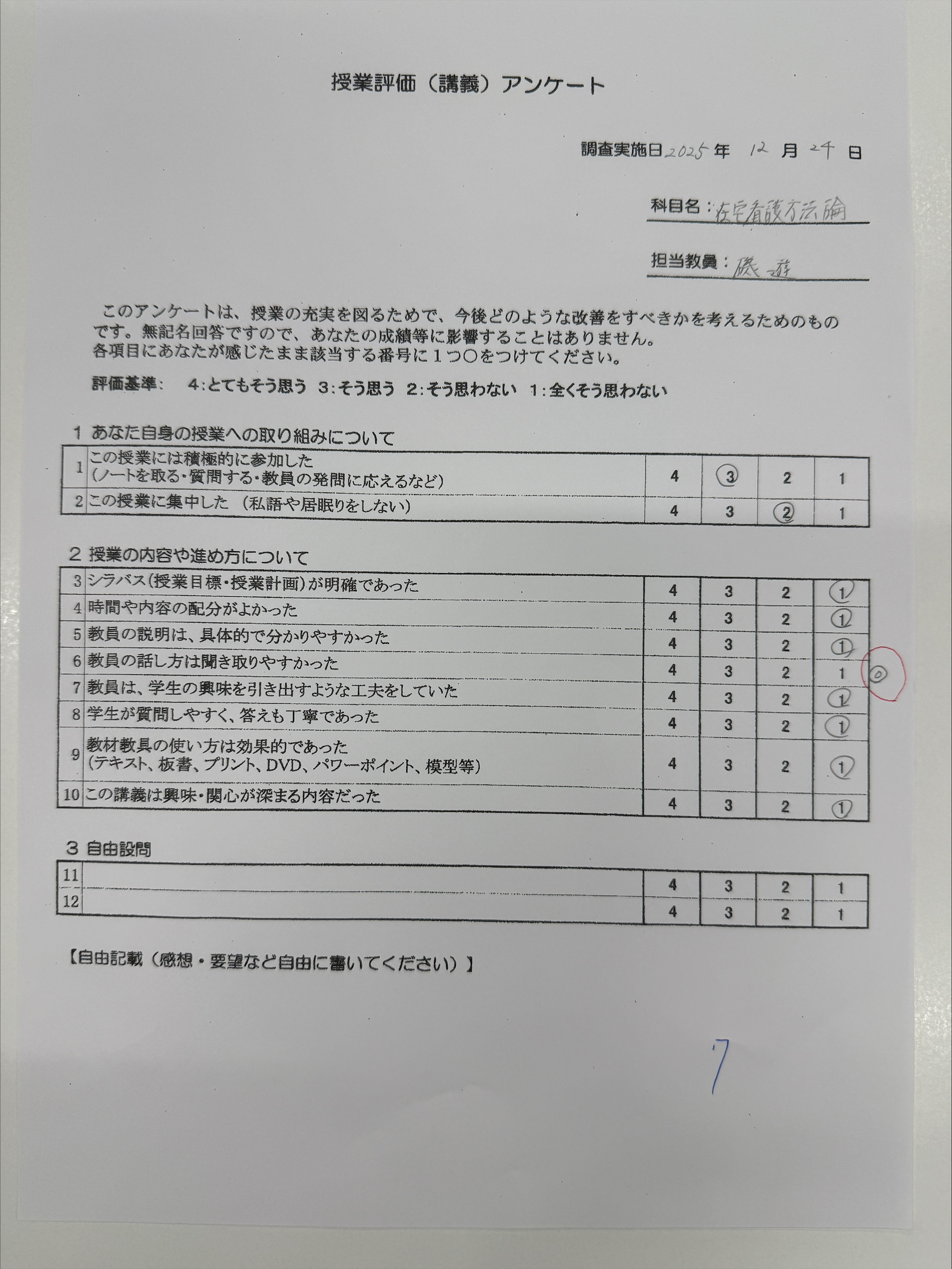 ・授業で自分のためにもなる話や興味が湧くような話をしてくれて、先生の授業楽しかった。→講義楽しんでいただきありがとうございます^^何か話の中に役に立つ事があって、それが活きる場面があった時は、また私に教えてください^^