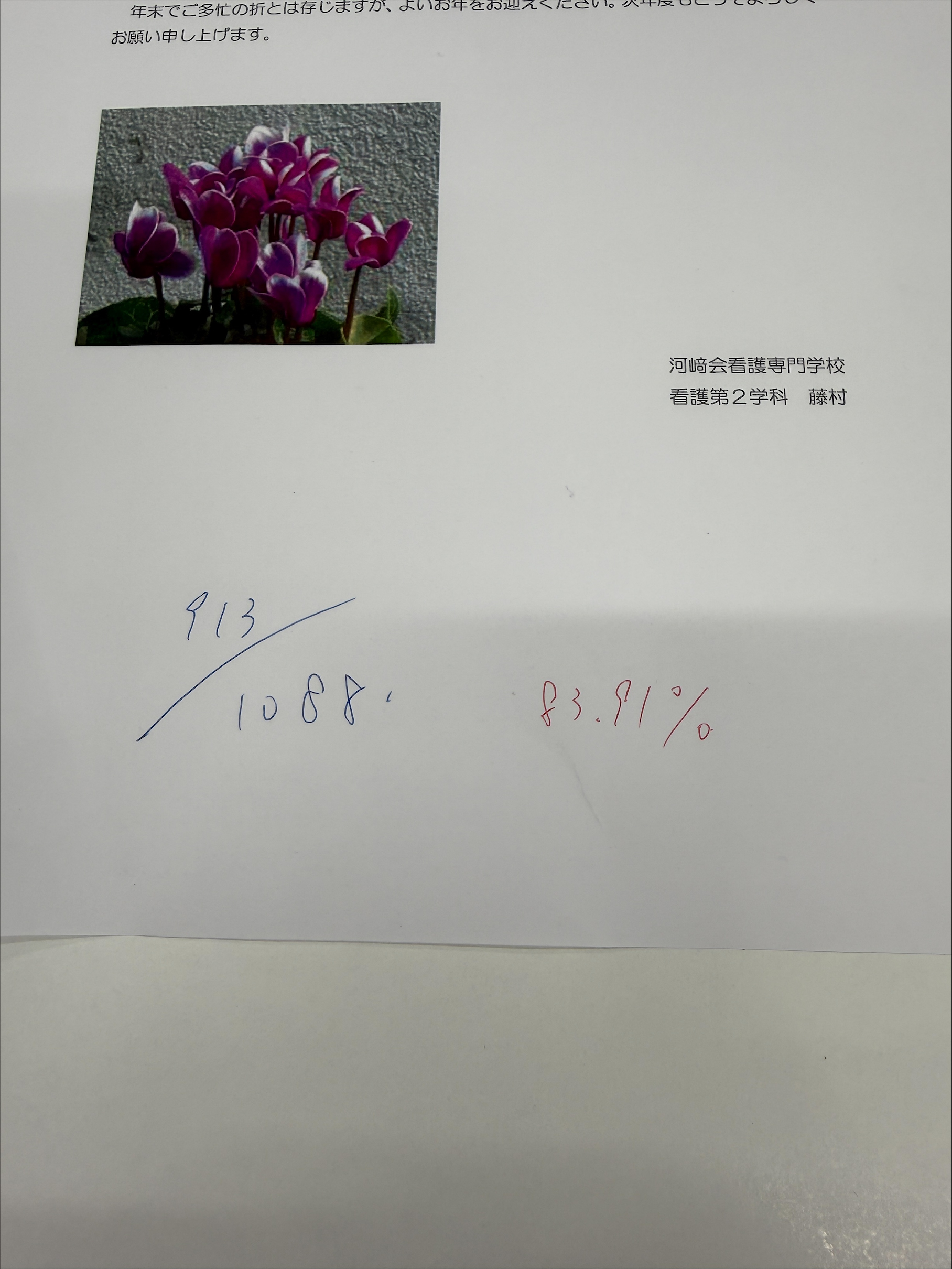 ・先生が色んなところからテストが出ると言っていたので、メガネの色や形黒板に書いていた文字など必死でメモしていました。先生は何でいつも同じ服着てるんやろうとか、先生イケメンやのにちょっと変わっておもしろいなとか、先生の事が気になりすぎて先生の言っていた「最初は嫌いかもしれないけど、最後は好きになってるよ」と言う言葉がこの現象のことか!!と改めて思いました。いつも在宅看護の範囲だけでなく、人間について言語化されていた授業は退屈にならなかったです。ありがとうございました。→私の発言にそんな現象が!!!^^W何度も申していますが、80%云々は過去の統計結果でございます。いつも同じ服を着ている理由は、①イメージの固定。私の事を知らなくても、背の高い上から下まで真っ黒の人と言えば分かる。②選択の減少。服を選ぶ時間や労力の減少。③卑屈を刺激しない。ただでさえイケメン・高身長・知的でありまして、人の卑屈を刺激してしまうのです。。。。と言うわけではないのですが、在宅は人の家にお邪魔しますし、いい服着てるな~と言う印象は関係の構築に邪魔になるのです。看護師って、白衣を着てるから看護師なんじゃないですよね^^たくさんメモしてくれてありがとうございました^^